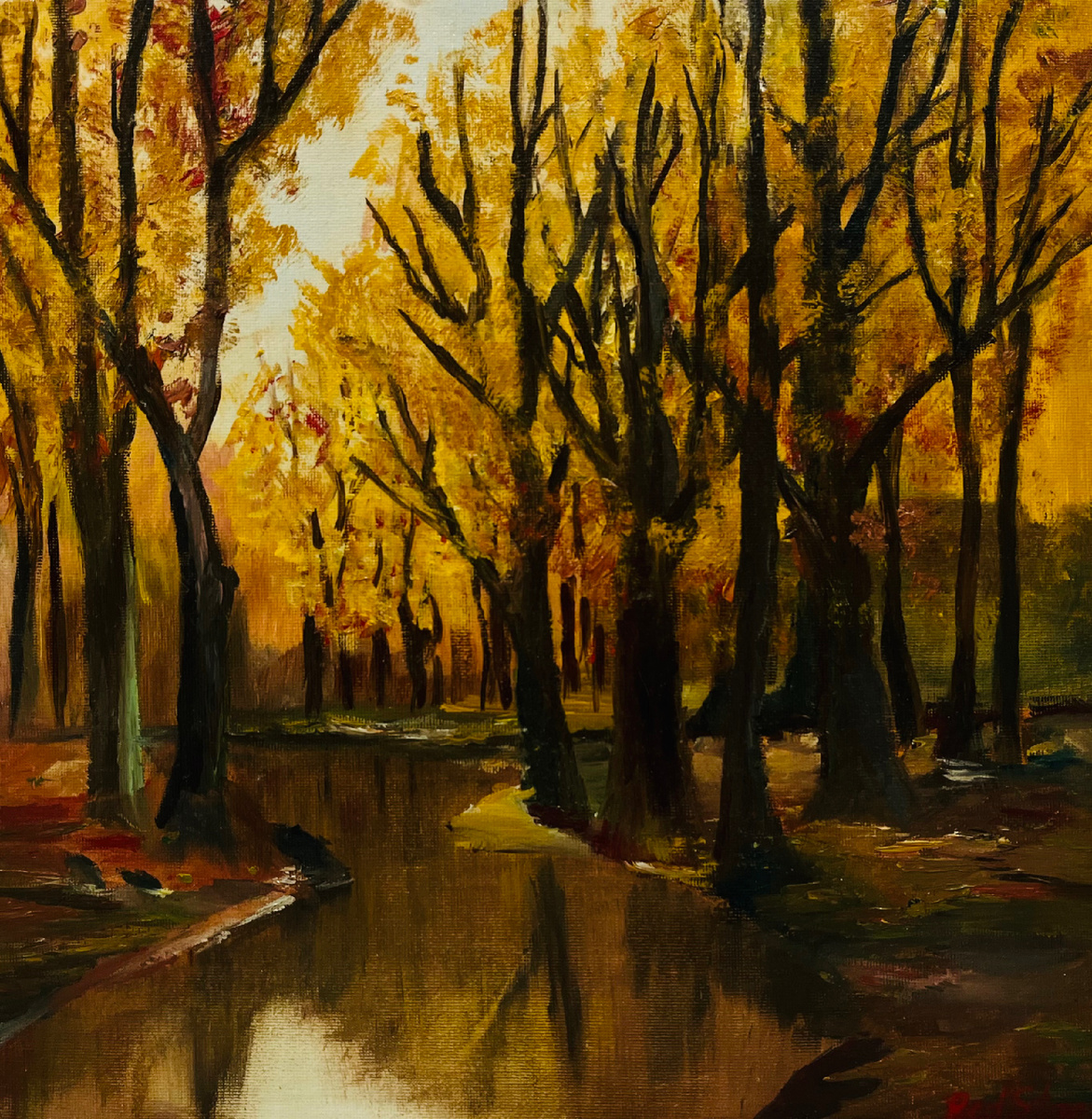 Золотая осень — картина, написанная маслом на грунтованном картоне размером 30 на 30 см в 2021 году. В этой работе запечатлён один из самых чарующих моментов природы — осень в её золотом убранстве. Лес из лиственных деревьев, окутанный теплыми оттенками золота, жёлтого и оранжевого, словно погружает зрителя в атмосферу уюта и тихого осеннего покоя. Маленький ручеёк, пробегающий через пейзаж, отражает свет осеннего дня, добавляя ощущение движения и живой природы. Вода тихо журчит, создавая гармонию с покоем леса. Каждый элемент картины — от тончайших ветвей до игривого ручья — приглашает вас насладиться красотой уходящей осени. "Золотая осень"— это не просто пейзаж, это воспоминание о тёплых днях, когда природа щедро дарит свои последние краски перед наступлением зимы. Эта картина станет источником тепла и гармонии в вашем доме, напоминая о мгновениях умиротворения и радости, которые приносит золотая осень С любовью ℝ🅔🅓⠀𝓢𝓣𝓐𝓡⠀✪