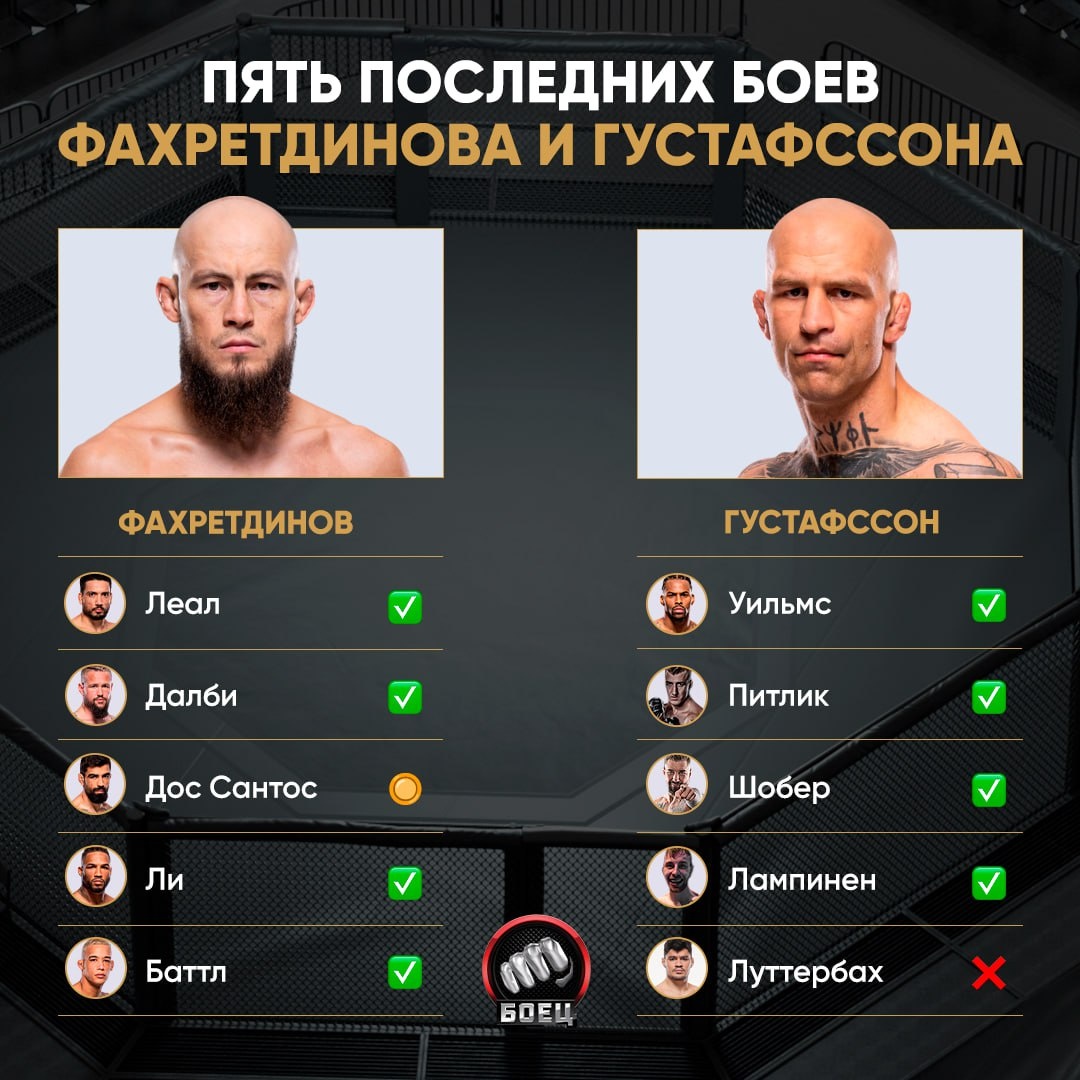 У Фахретдинова и Густафссона по четыре победы в последних боях 😎 Правда у Рината есть одна ничья. Да и все поединки прошли в UFC 👊 Андреас же один раз проиграл. И пока в UFC у него лишь один бой 👀 Посмотрим их противостояние в предварительном карде турнира в Париже. Трансляция в эту субботу 😉