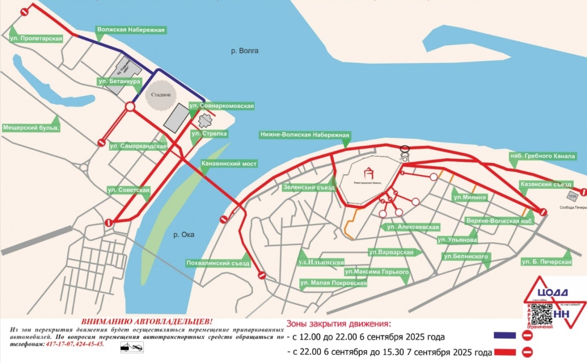 С 22:00 6 сентября до 15:30 7 сентября будут перекрыты вся Волжская, Верхневолжская и Нижневолжская набережные, Стрелка, Канавинский мост, площади Благовещенская и Минина и Пожарского, а также Похвалинский, Зеленский, Георгиевский и Казанский съезды.