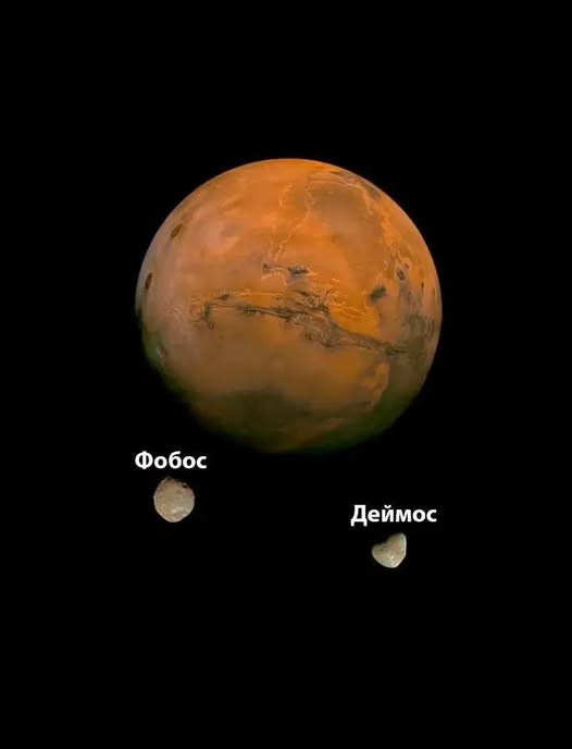 Спутники Марса Фобос и Деймос были обнаружены в 1877 году, хотя были описаны за 150 лет до их открытия наукой. В книге "Путешествиях Гулливера" говорится, что астрономы летающего острова Лапута открыли у Марса два спутники с периодом обращения в 10 и 21,5 часов (реально их периоды 7,7 и 30,3 часа). Затем советский астроном Шкловский объявил, что Фобос может быть искусственным, а не естественным телом, так как он обнаружил, что орбита и скорость Фобоса меняются не так как у природного спутника. Поздней Шкловский признал свою ошибку и стал ярым противником гипотез о жизни в космосе. Очень долгое время считалось, что спутники Марса являются астероидами, захваченными планетой. Но, довольно правильная форма орбит спутников Марса и положение их орбитальных плоскостей, почти совпадающих с марсианской, говорит о том, что возраст спутников может совпадать с возрастом Марса. Фобос (26,8×22,4×18,4 км) — крупнейший спутник Марса, совершает один оборот вокруг планеты за 7 ч 39 мин 14 с, что быстре