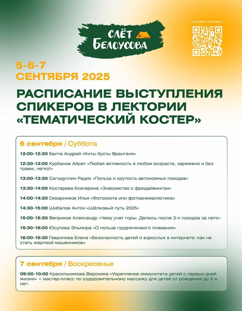 🔥 Готовы к вдохновению и новым знаниям? 🔥 В этом году лекторий «Тематический костер» порадует вас яркими и познавательными выступлениями! Наши спикеры – настоящие эксперты в своих областях, которые поделятся с вами ценным опытом и интересными идеями. ✨ Загляните в расписание на картинке и выбирайте лекции по душе! ✨ Вас ждут увлекательные темы, вдохновляющие истории и возможность расширить свой кругозор. Не пропустите возможность зарядиться новыми знаниями и пообщаться с интересными людьми! До встречи у «Тематического костра»! 🏕️ #Росмолодёжьгранты #Росмолодёжь #слётбелоусова #Турфестиваль