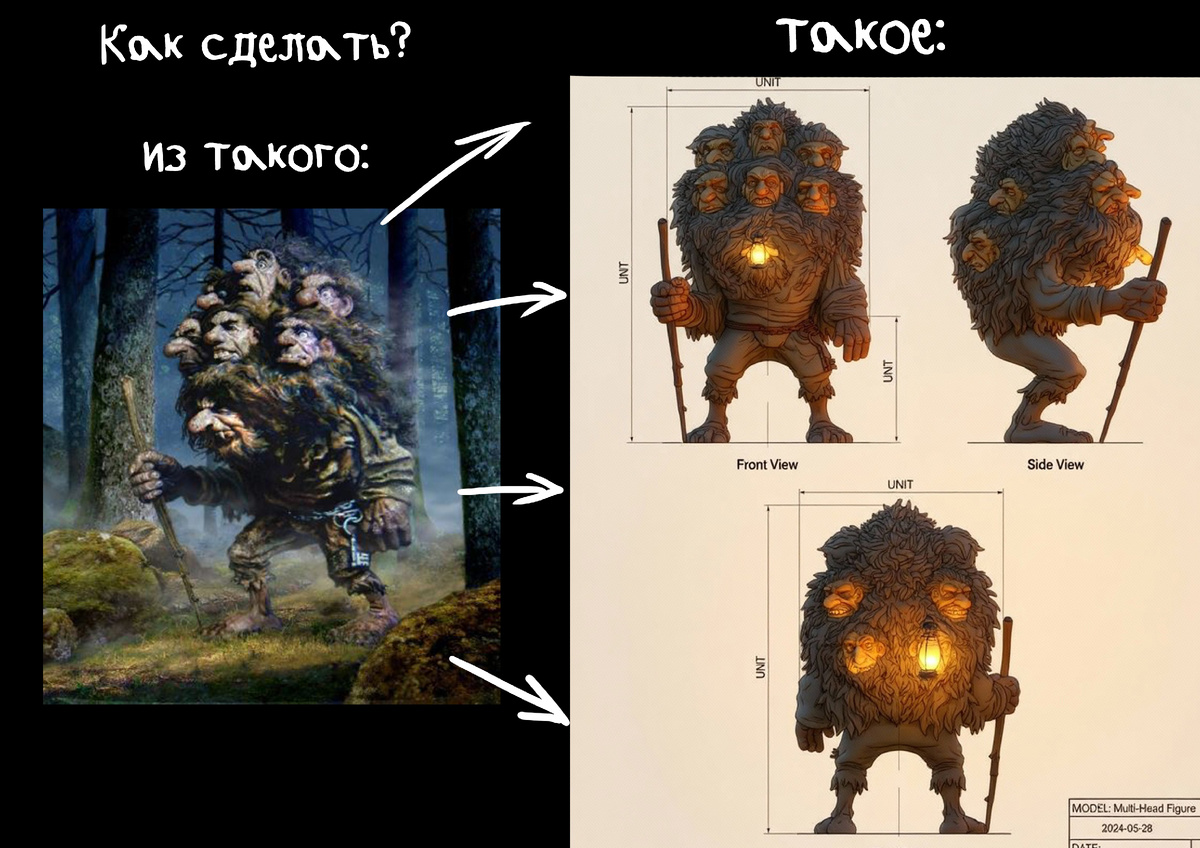 Или такое: Как сделать из любой картинки персонажа в трех проекциях для получения к примеру референсов для лепки и покраса. Все достаточно просто. Сейчас объясню.Ищем понравившегося персонажа в 2д. Подойдут любые, но лучше в полный рост и на однотонном фоне (лучше белом) Вначале необходимо сгенарировать из картинки фигурку. Хотя в теории можно и все сразу сгенерировать. Но мне удобнее было по частям. Для этого я пользовался этой бесплатной нейросетью: lmarena.ai/ Промт: Draw a perspective model of the character based on the image provided as a life-size figurine on a 1/7 scale. Please convert this image into a photograph of the actual figurine. The figurine should be styled after Bandai figurines. I would like the PVC material to be clearly visible. The background should include a computer desk and a packaging box with the figurine Промт можно варировать под ваши нужды естественно. Я использовал этот. Кидать как уже говорил своего перса в нейронку лучше в полный рост на белом фоне, наж