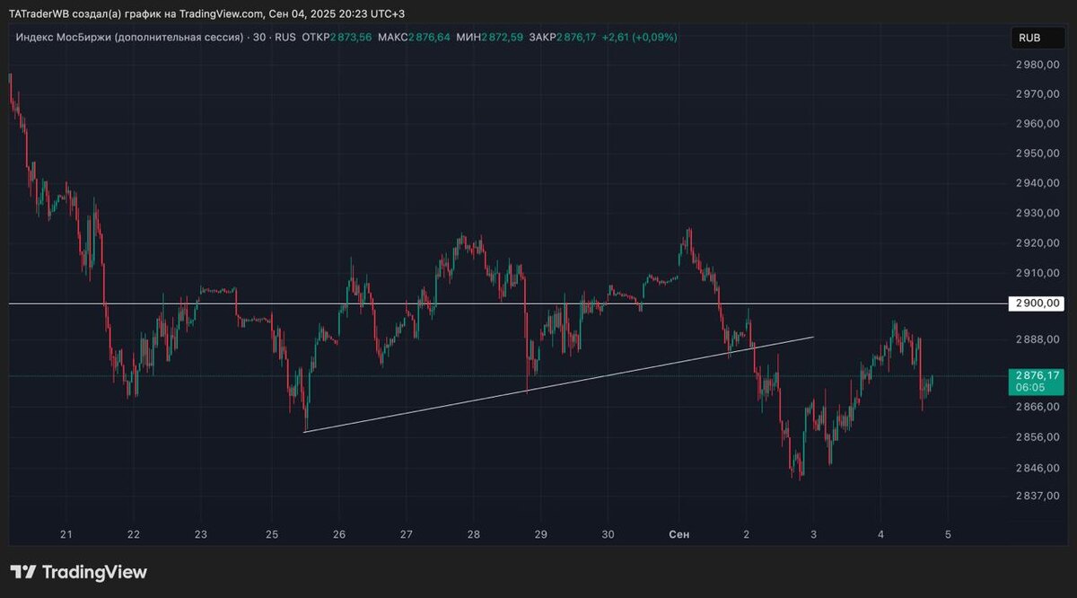 📝 КАК БУДЕТ ДАЛЬШЕ? ✅ Больше половины сегодняшней торговой сессии рынок стоял в боковике и никуда не двигался, лишь под закрытие дав нисходящее движение в сторону закрытия гэпа, о котором как раз таки и писал. В итоге получается слабое, но шортовое закрытие, да и в целом нет как таковых драйверов на рост. (Кроме ставки, но про нее мы поговорим завтра, будет интересный пост). 💯 Поэтому по причине отсутствия покупателя, а также слабости рынка жду его коррекции к 2850 - 2860, а там дальше будем смотреть по факту. Все самое свежее и интересное будет завтра утром, по классике. Всем отличного вечера! 🤝