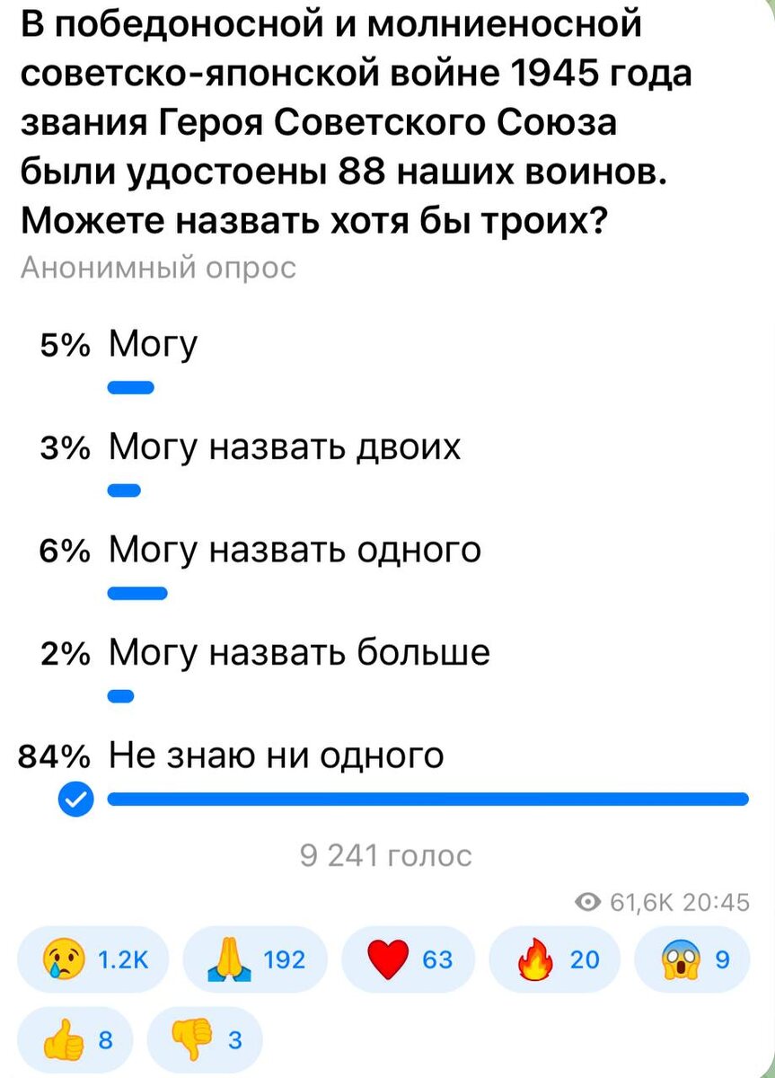 ⚡️⚡️⚡️ 84 процента проголосовавших не могут назвать ни одного Героя советско-японской. Лишний повод заглянуть в учебники. Как написала подписчица: «Спасибо за опрос - пошла изучать вопрос».