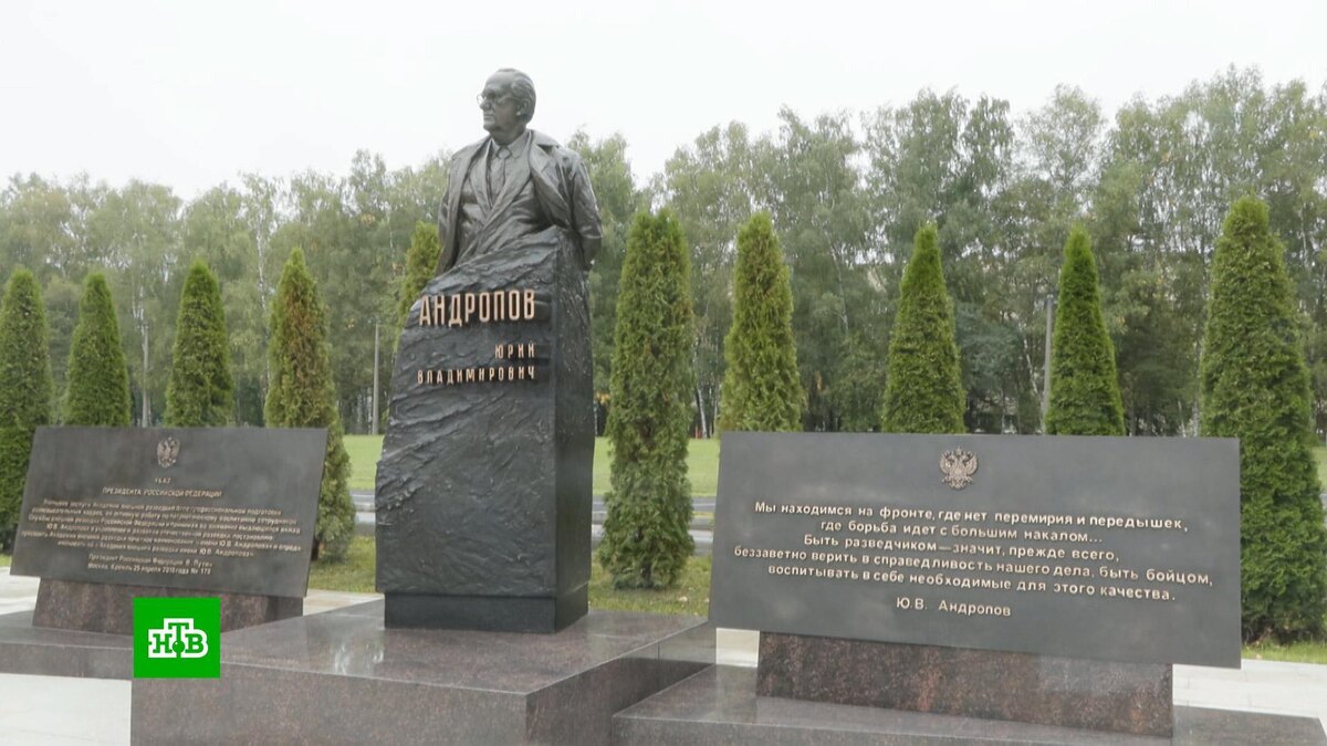 [ Смотреть видео на сайте НТВ ] Памятник советскому чекисту Юрию Андропову открыли на территории Академии внешней разведки, которая сегодня носит его имя. В 1982 году он стал первым сотрудником госбезопасности, который возглавил нашу страну. А до этого он 15 лет руководил КГБ. И до сих пор среди разведчиков его вспоминают как сильного, целеустремленного и решительного человека. Под руководством Андропова Высшая разведывательная школа была преобразована в Краснознаменный институт КГБ СССР, который окончил и Владимир Путин. В торжественной обстановке бюст видного советского деятеля открыли помощник президента Владимир Мединский и директор СВР Сергей Нарышкин. Чтобы определить лучшего автора памятника, Военно-историческое общество объявляло творческий конкурс. В нем победил скульптор-монументалист Денис Стритович, которому в итоге удалось удивительно точно передать образ Андропова. [ Смотреть видео на сайте НТВ ]