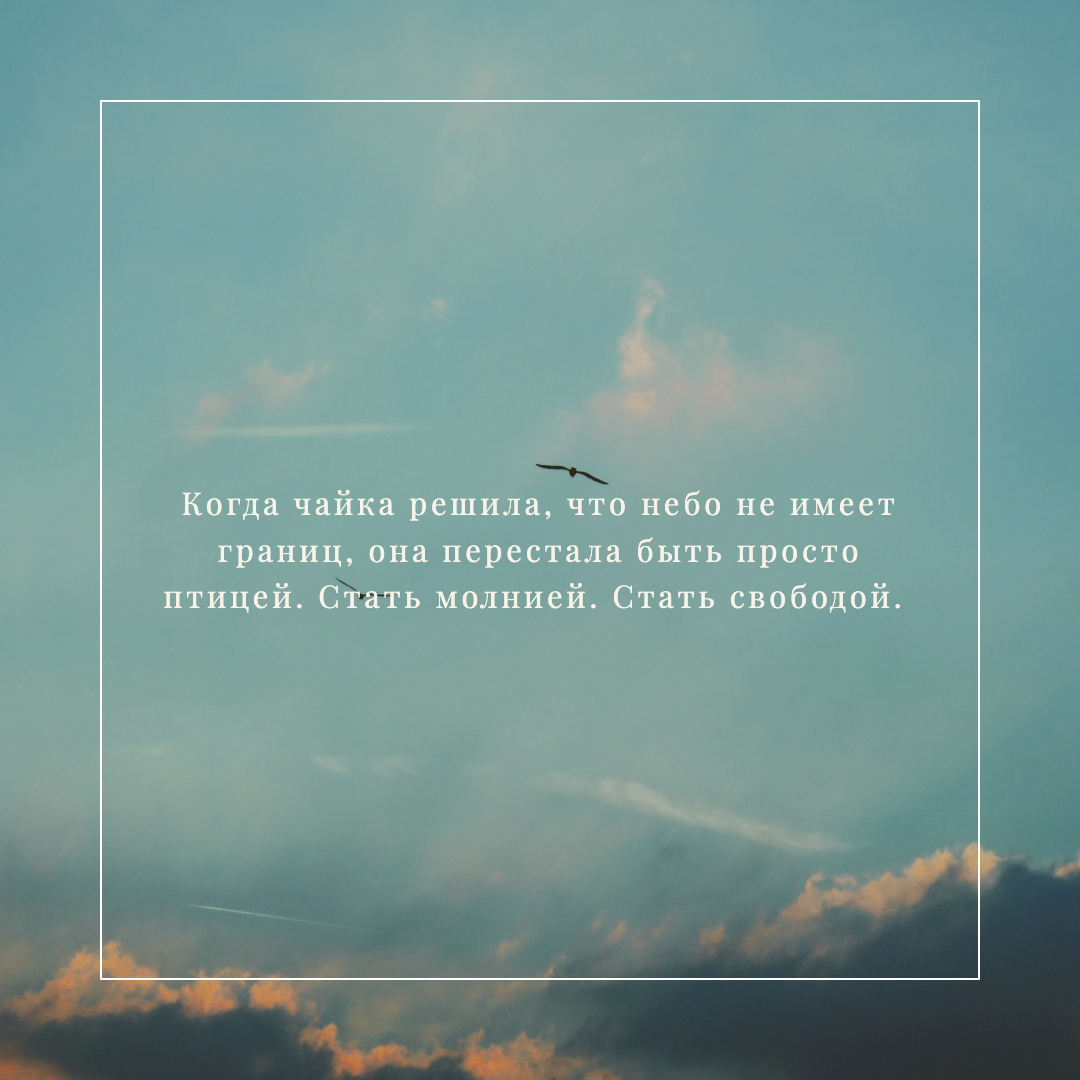 Фрагмент из «Чайки по имени Джонатан Ливингстон» *«Для большинства чаек главное — не скорость, а еда. Для Джонатана же, который знал, что в жизни есть нечто более важное, голод был не главным. Ему нравились те мгновения, когда он, разогнавшись, почти касался воды, и вдруг — рывок крыльев, рывок сердца — и он взлетал над волнами, свободный, один в бесконечном небесном пространстве. — Зачем? — спрашивали родители.