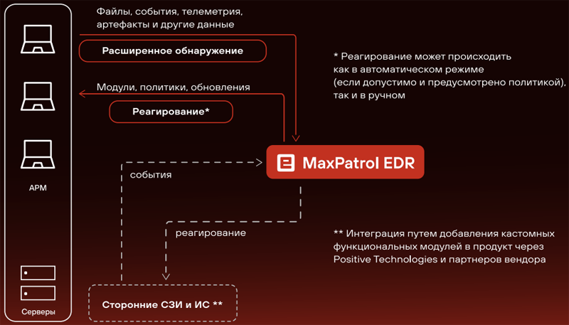 Для упрощения интеграции с другими решениями безопасности добавлена поддержка передачи событий на syslog-сервер. Новая версия поддерживает несколько протоколов и форматов, применяемых более чем в 250 сторонних решениях, включая SIEM, SOAR и IRP, что позволяет автоматически отправлять данные с конечных точек для последующего анализа.