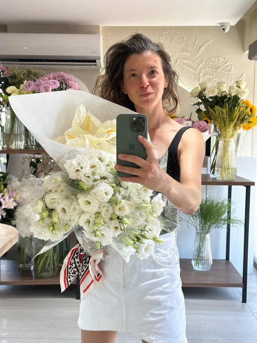 Оставлю маленькую интригу на ночь 🌙 Сегодня забрала просто нереально красивые цветы 🌸 — снова антуриумы и снова лизиантусы, но на этот раз — белые 🤍 Как думаете, что завтра буду делать? 😉