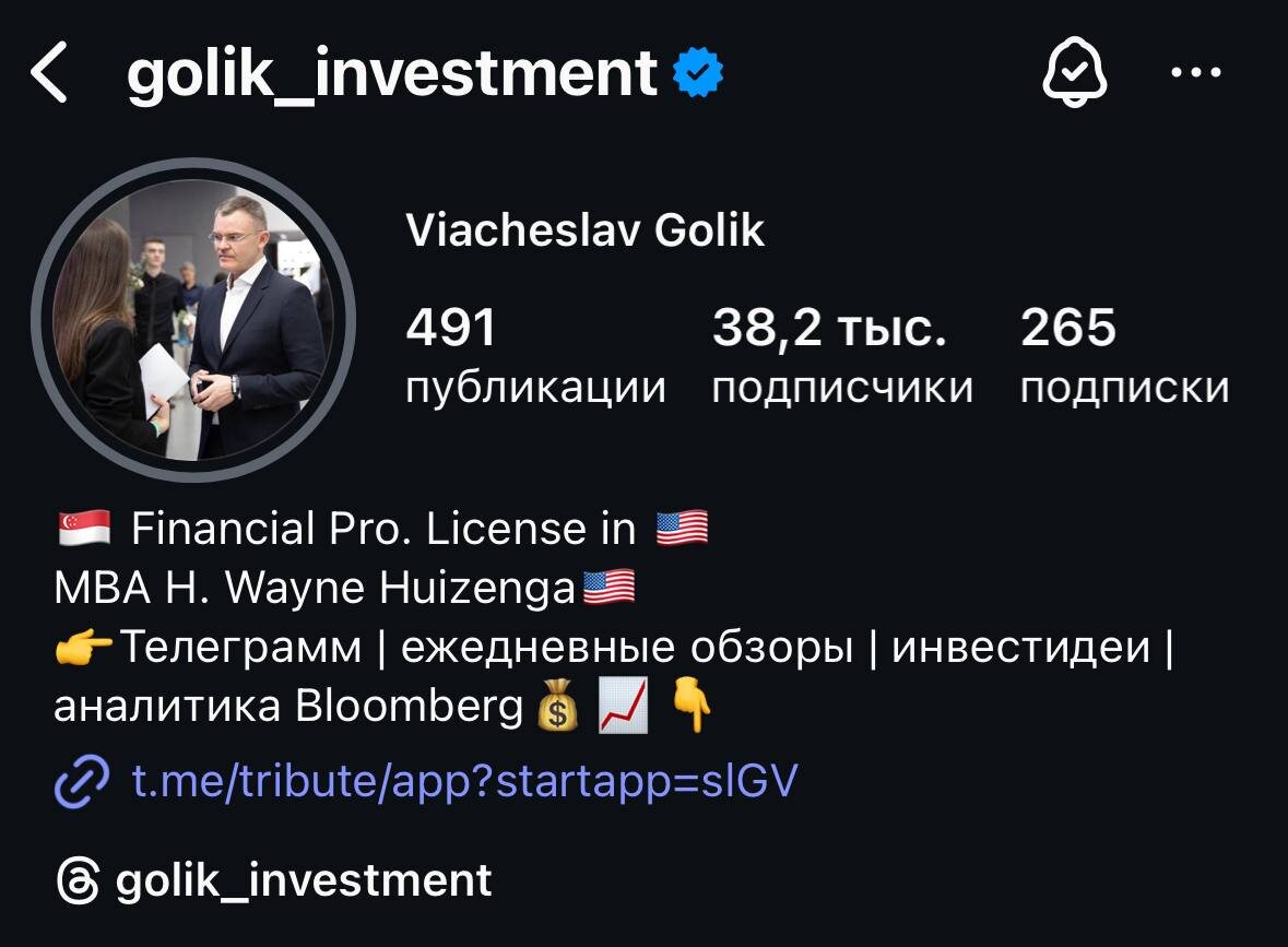 В ответ на пост https://www.instagram.com/golik_investment?igsh=MTVmcWpuYXR3d3dzYw== Если кто не знает человека из кружочка. Мега человек!!! Не раз проводил с ним эфиры. Живет в Сингапуре. Лицензированный в США управляющий. Управляет капиталами в сотни миллионов долларов. Это совсем другой класс и уровень. У нас я с такими не знаком. Инвестирует только в зарубежные рынки. Но оно и логично))) Мы сегодня посмеялись, как от сигнала пастухов у нас голубые фишки могут прыгнуть на полпроцента)))) Может как-нибудь сделаю с ним эфир. Мы с ним можем бесконечно общаться и не только про рынок. *ну и там ссылка на ресурс, который запрещен в России и что-то там