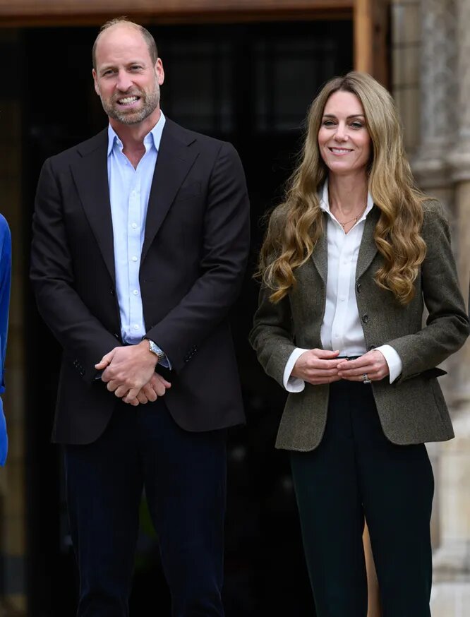 Влиятельная пара британской монархии приступила к работе после длительных летних каникул. Сегодня принц и принцесса Уэльские посетили Музей естествознания в Лондоне. Кейт Миддлтон выбрала деловой стиль. Она предстала в белой офисной блузке с длинными рукавами, приталенном твидовом блейзере в темно-песочном оттенке от Ralph Lauren и темно-зеленых зауженных книзу брюках. Образ дополнил простой ремень из черной кожи с золотой пряжкой. Вместо традиционных лодочек на шпильке принцесса Уэльская выбрала более удобный вариант – остроносые балетки из горчичной замши на низком каблуке. Из украшений главная королевская модница надела лаконичные серьги-капли из золота, свое помолвочное кольцо с сапфиром и ожерелье от Даниэллы Дрейпер, на котором выгравированы инициалы их с Уильямом детей: 12-летнего Джорджа, 10-летней Шарлотты и 7-летнего Луи. Кейт сделали дневной макияж с акцентом на глаза и нюдовым блеском для губ. Наибольшее внимание публики привлекла новая прическа жены принца Уильяма. Долгие