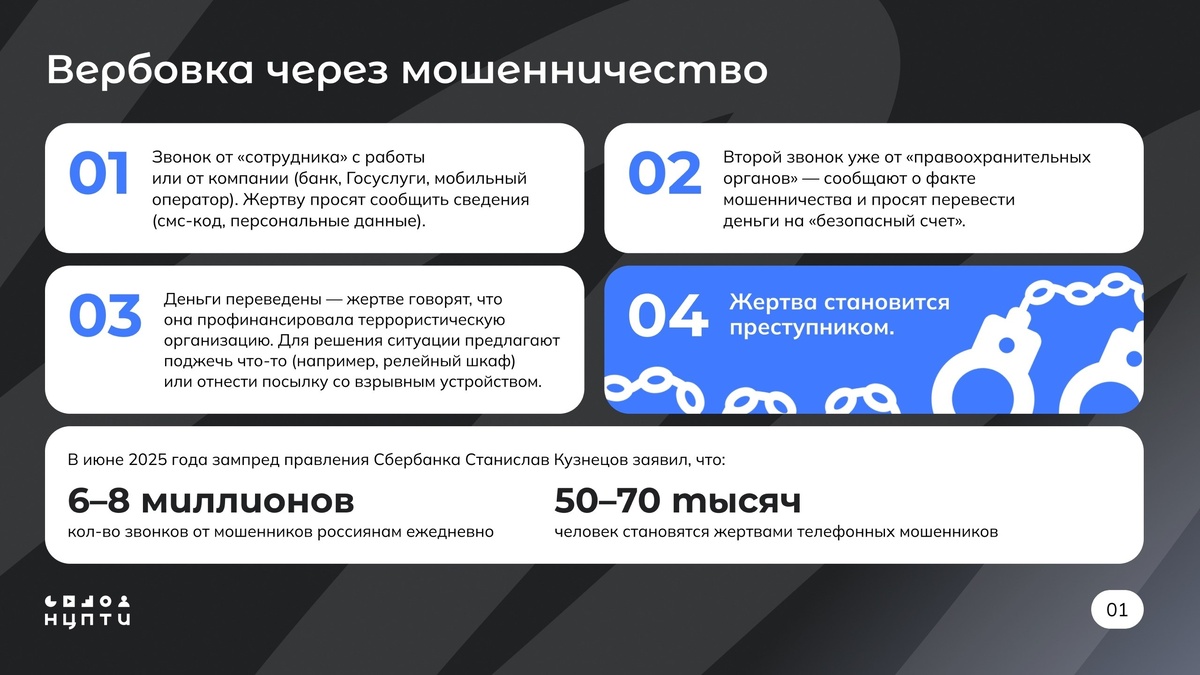 Молодежь одна из наиболее уязвимых групп для вовлечения в деструктивную деятельность. Актуальные угрозы для молодежи: вербовка в террористическую и экстремистскую деятельность, вовлечение в работу нежелательных организаций. Иногда вербовка в незаконную деятельность начинается с безобидного звонка или сообщения. Источник https://uchaly102.ru/?p=98355
