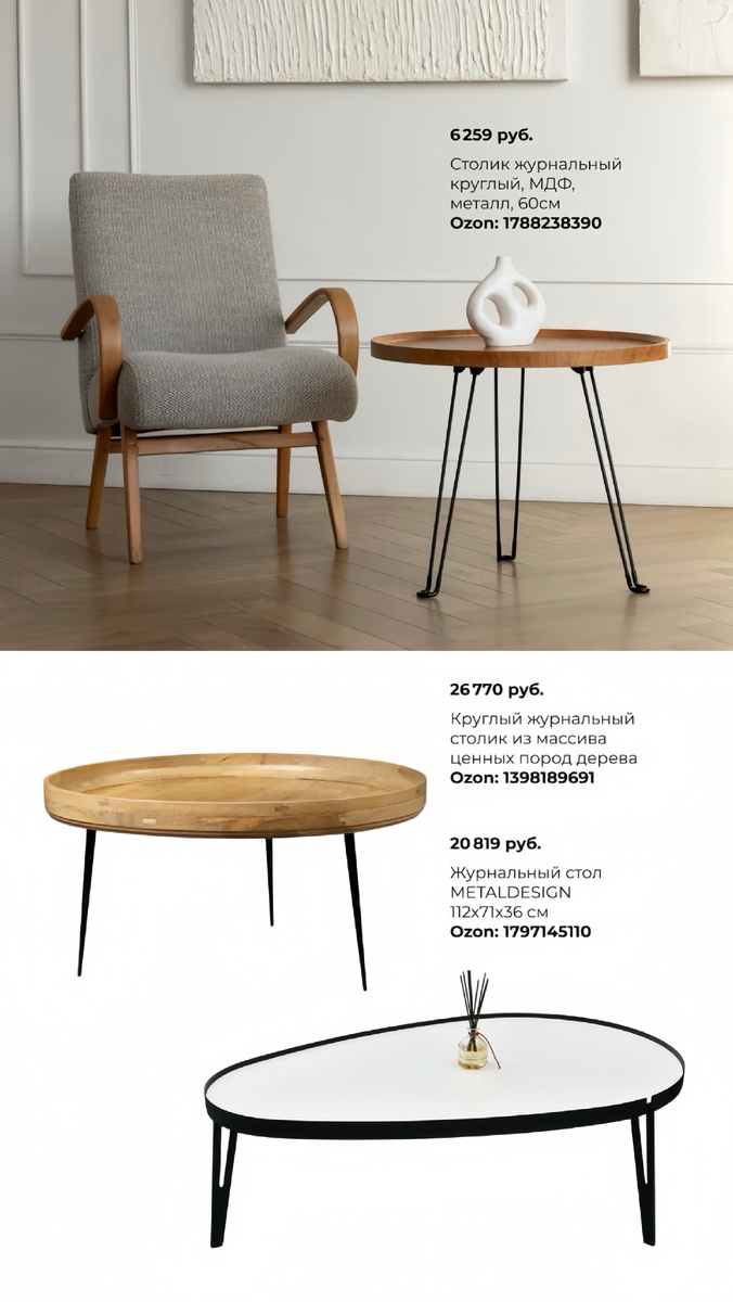 Журнальный столик — маленький предмет с огромной силой. Он держит центр гостиной, собирает компанию дивана и кресел, становится сценой для книг, свечи и чашки кофе. Я собрала 12 удачных столиков с Ozon — от лёгкой графики до скульптурного дерева. Ниже — каждая модель строго по артикулу (кликабельно), подробное описание и совет стилиста, как вписать её в дом.