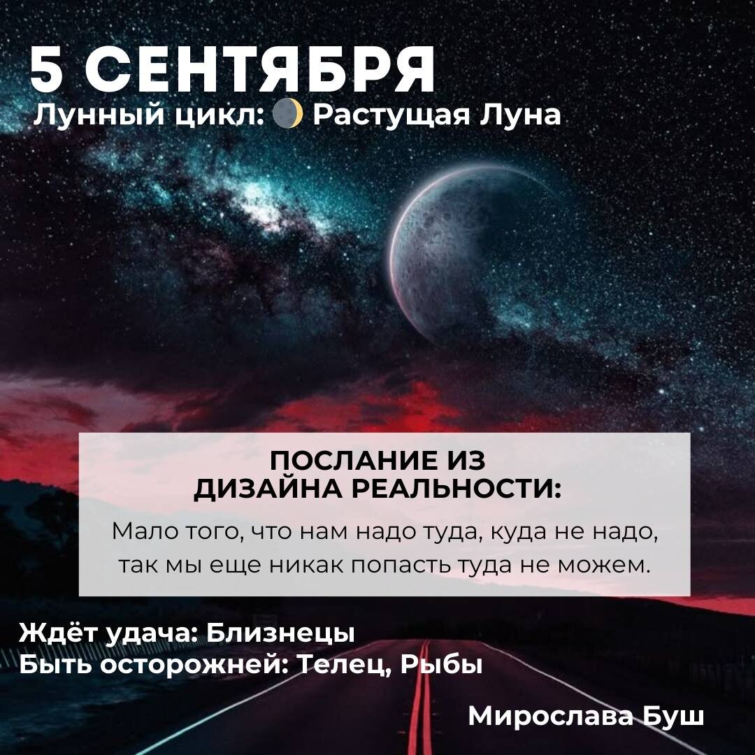 5 сентября РЕКОМЕНДАЦИИ: 💪 День сильных, решительных действий. Именно завтра можно сделать шаг, решающий исход всего дела. Или сделать первый шаг в серьезных начинаниях. Не распыляйтесь на мелочи. 🧿 В этот день интересно отслеживать: кто и куда нас позвал. Это дает информацию о том, какие силы в нас заинтересованы. Может открыться истина. ✉️ Подписаться на Мирославу #прогнознадень