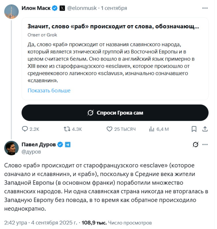 Не так давно в сети X (бывшая Twitter) Илон Маск поделился удивлением о том, что английское слово Slave произошло от слова Slavic или, более точно, от старофранцузского esclave, означающего «славянин». Павел Дуров пояснил, что это восходит к средневековой практике, когда многие славяне, особенно захваченные в войнах в Западной Европе, становились жертвами работорговли, таким образом, у них «славянин» и стал практически равен «рабу». Признаться честно, я не задумывался об этом ранее и не знал этого. Тем более что слово «раб» в русском языке имеет другое происхождение — от праславянского «орбъ» (лишённый родителей, сирота), который часто был вынужден выполнять тяжелую работу за других, чтобы выжить. Само по себе слово «раб» не имело изначально резко негативного подтекста. Таким образом, слово «работа» произошло от слова «раб», а не наоборот. Мне же стало интересно разобраться в происхождении английского слова slave, что я и сделал, и решил поделиться с вами. Откуда же взялось слово «slav