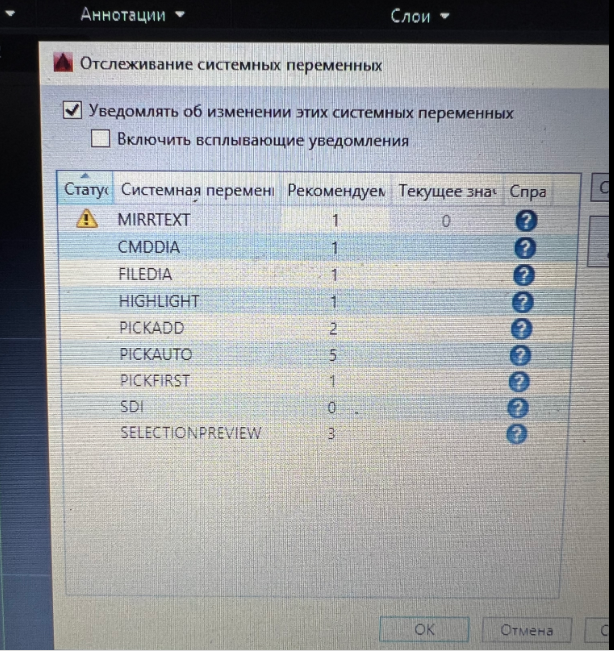 Работа в автокаде иногда требует каких-то тончайших настроек, например, как-то я писал про FileDIA (это когда автокад просит путь сохранения в виде строчки, а не так как мы привыкли с папками). Один из пользователей AutoCAD спросил - "Каждый раз бывает что-то и выскочит, почему не знаю. Может подскажете как что расставить в этой таблице автокада?": Окно в автокаде, которое открывается, чтобы пользователь смог отслеживать состояние системных переменных. Важно понимать для начала, что это окно возникает, когда AutoCAD обнаруживает, что какая-то из важнейших системных переменных изменилась на такое значение, которое отличное от того, которое указал пользователь как «Рекомендуемое».