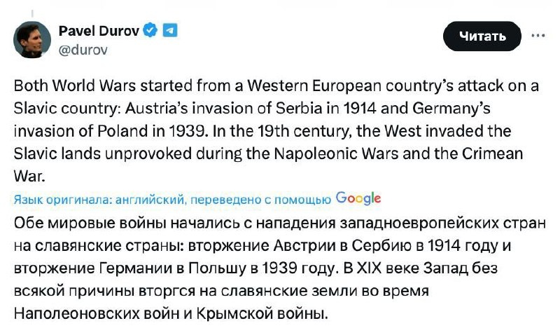 «Обе мировые войны начались с нападения Запада на славян» — Дуров дополнил свою тираду против Европы Основатель Telegram Павел Дуров не остановился на достигнутом и продолжил свою критику Европы. Он добавил к своей публикации в X, что обе мировые войны начались именно с нападений западноевропейских стран на славян: Австрия вторглась в Сербию в 1914 году, Германия — в Польшу в 1939-м. Дуров напомнил, что и в XIX веке Европа регулярно шла войной на Восток без всякого повода — вторжение Наполеона в Россию, Крымская война против Российской империи. Ранее владелец Telegram заявил, что «ни одно славянское государство не вторгалось в Западную Европу», и обвинил европейцев в вековой ненависти к восточным соседям. То что, как он пишет, слово «раб» в европейских языках напрямую связано со словом «славянин» — результат тех самых вторжений.