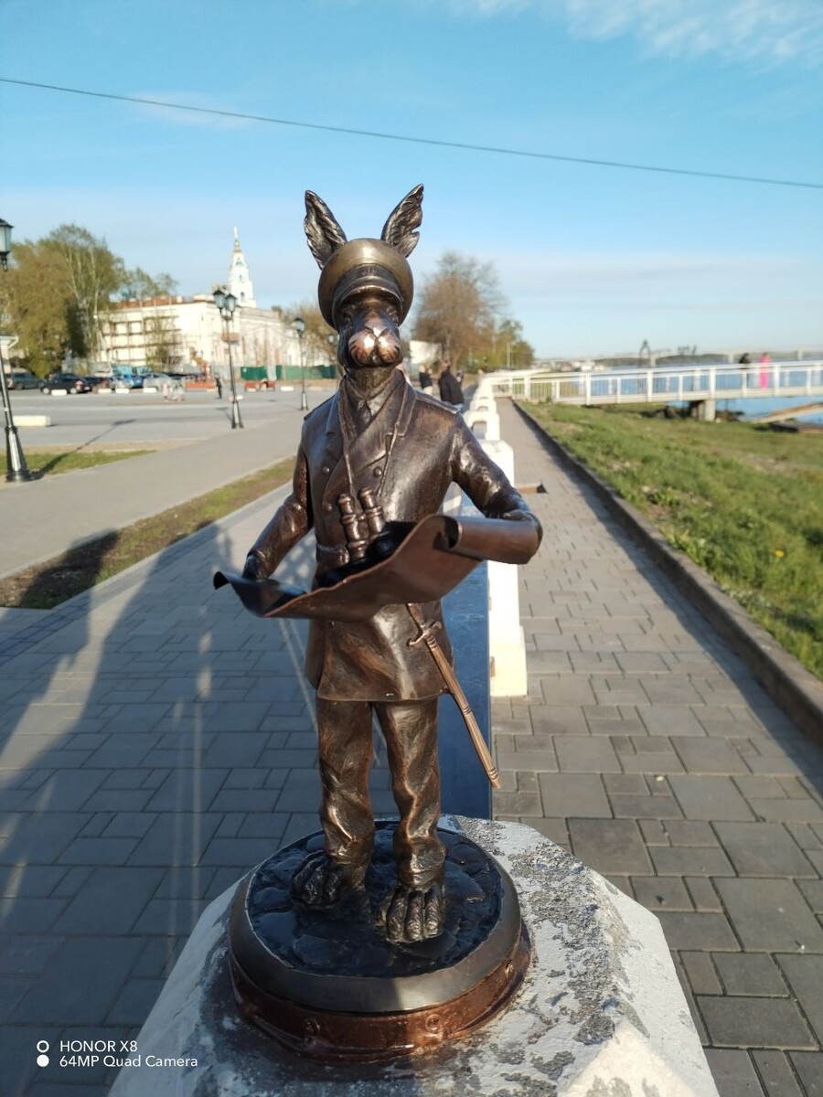 Кострома--старинный русский город. Славен Снегурочкой, династией Романовых, ювелирных дел мастерами, сыром, пожарной каланчой, Даниилом Воробьёвым , Романом Курицыным и Мазаем с зайцами. Вот последних и решили увековечить в виде небольших жанровых фигурок. Начнём с набережной. Логично, чтоб это был моряк. Вот он. Хоть и зовётся моряком, но на мой взгляд, это аллюзия на адмирала Геннадия Ивановича Невельского, исследователя Камчатки и Дальнего Востока Дальше можно подняться к беседке, в которой поджидала Паратова Лариса и там прелестная дама с дочкой Сейчас заинька, благодаря стараниям пещерных костромичей, лишилась зонта. Поэтому фотки старые. А чуть правее зайка-гимназистка. Вот она. Зайка--старшая дочка дамы А дальше нас встречает трактирщик. Фото старое, потому что улица перекопана, и фон непрезентабельный. А следующий заяц--заяц-фонарщик. В Белоруссии есть фонарики. Настоящие. А у нас пока только зайка А недавно поблизости поставили почтальона Зайкина Пойдём поищем ещё одного.
