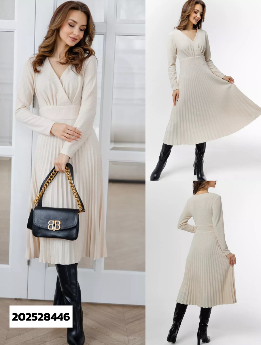 - Фактура: мягкий трикотаж в тонкий рубчик + плиссированная юбка.