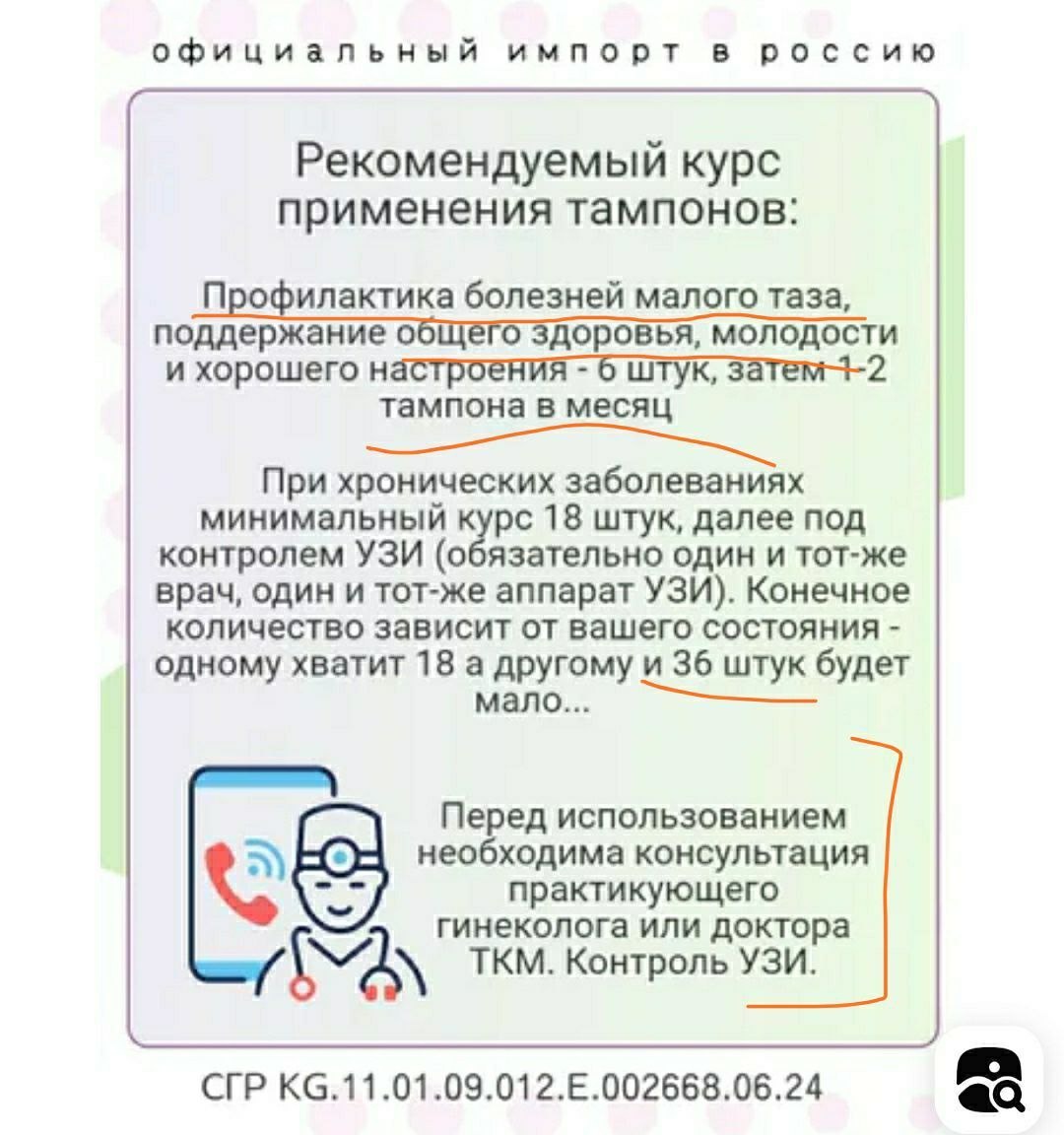 Еще раз подчеркивается, что тампоны могут применяться буквально для всего, в том числе молодости, хорошего настроения.. Количество тампонов, которые могут понадобиться с целью профилактики может быть разным, они могут использоваться очень долго. Очень здравая мысль, что необходима консультация гинеколога и контроль УЗИ. Вот здесь я абсолютно согласна✅