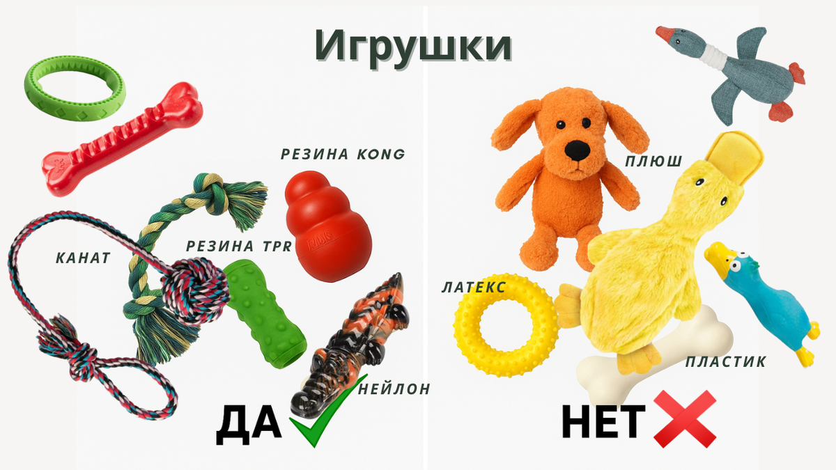А вот мягкие плюшевые зверушки и тонкий латекс со свистками— это скорее игрушки «на один вечер». Игрушки «погрызушки» (кости и жевательные палочки), могут быть опасны для здоровья вашего питомца. Хотите экономить и сохранить нервы — выбирайте надёжное.