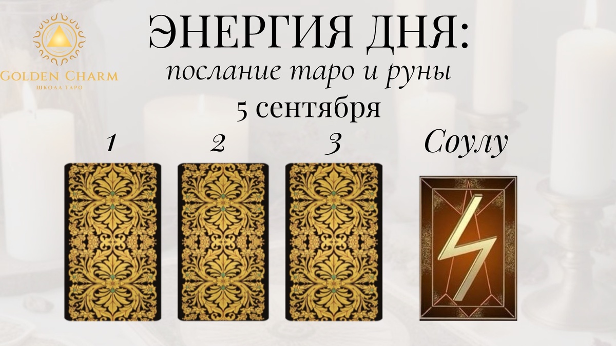 Заказать личный расклад тут✅ Прогноз на 5 сентября: что тебя ждёт Приходи на обучение Таро ✅ Выбери карту — 1, 2 или 3 — и узнай, какой путь для тебя: 1. Отшельник Сегодня возможно желание уйти в себя, погрузившись в размышления и самоанализ. Это отличный день для глубоких внутренних прозрений и принятия важных решений. Прислушайся к своей интуиции и внутренним голосам. 2. Туз Пентаклей Открываются новые возможности и перспективы в материальном плане. День благоприятствует финансовым вопросам, инвестициям и новым проектам. Действуй уверенно и смело бери инициативу в свои руки. 3. Девятка Мечей Возможно появление беспокойства или тревожных мыслей. Постарайся сохранять спокойствие и ясность ума. Медитация и релаксация помогут справиться с негативными эмоциями. Руна дня — Соулу Символизирует солнечную энергию, рост и развитие. Сегодняшний день принесёт положительные изменения и продвижение вперёд. Используй этот потенциал для достижения своих целей. Напиши цифру карты