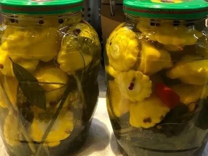 Ингредиенты: На 1 литровую банку: - 0,5 кг патиссонов - 2 листа хрена - маленький пучок сельдерея - 2 веточки мяты - маленький пучок укропа - 1-2 стебелька зелени петрушки -1 зубок чеснока Маринад: На 1 воды: - 2,5 ст. л. соли - 1,5 ст. л. уксусной эссенции - 2-3 куска сахара Приготовление: Патиссоны небольшого размера моют, удаляют плодоножку, опускают в кипящую воду на 3-5 минут исходя из величины плода, после чего сразу охлаждают в холодной воде. Далее их плотно укладывают в стерильные банки вместе с ароматными травами и дольками чеснока, заливают горячим маринадом. Банки подвергают стерилизации: ёмкости объемом 1 литр обрабатывают 8-10 минут, трёхлитровые — около 20-25 минут.