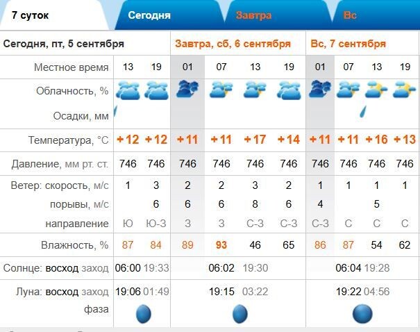 🍁 Прогноз погоды на первые выходные осени 🌥В субботу, 6 сентября, ночью +11, днём до +17, облачно, без осадков, ветер северо-западный до 8 м/с. 🌦В воскресенье ночью также +11, днём не выше +16, облачно с прояснениями, не исключен небольшой дождь, ветер северный 1-5 м/с.