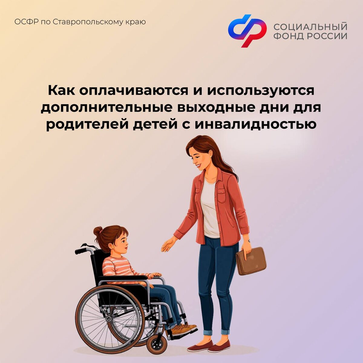 👫Работающие родители, опекуны или попечители, которые воспитывают детей с инвалидностью, имеют право на четыре оплачиваемых дополнительных выходных дня в месяц. ⁉️Как они оплачиваются? 💳В размере среднего заработка работника. Оплата дней осуществляется работодателем из собственных средств, затем эту сумму компенсирует Отделение СФР по Ставропольскому краю. ⁉️Когда можно брать дополнительные выходные? Выходные дни можно брать подряд или в разные даты в течение месяца. Их можно «накапливать», а потом использовать до 24 дней подряд. А также делить между работающими родителями. Как оформить? 📋Подать заявление работодателю, а также согласовать с ним график выходных дней. Компенсировать допвыходные денежными средствами или перенести на другой год нельзя. Дополнительные выходные не предоставляются, если родители находятся в ежегодном оплачиваемом отпуске без сохранения заработной платы или в отпуске по уходу за ребенком до 3 лет. #СФР, #инвалиды #доступнаясредасфр