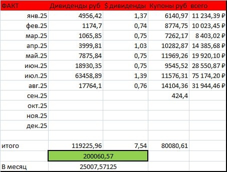 🔥 Пассивный доход от фондового рынка превысил 200 000 рублей! 🔥 Дивидендный сезон близится к своему завершению, но даже с учетом этого, выплаты с начала года уверенно преодолели отметку в 200 000 рублей! 🚀 Только за июль и август на мой счет поступило около 100 000 рублей дивидендов и купонов. Это значит, что среднемесячный пассивный доход составил примерно 25 000 рублей. Конечно, это пока не огромные суммы, но радует, что эта цифра уже приближается к МРОТ в Ростовской области (который составляет 26 928,0 руб.). Уверен, что в следующем году мой пассивный доход от фондового рынка перешагнет и эту отметку! 💪 Инвестиции – это не всегда про быстрые деньги, но про уверенное движение к финансовой независимости. Главное – последовательность и терпение. #инвестиции #дивиденды #пассивныйдоход #фондовыйрынок #финансы #рост #мотивация