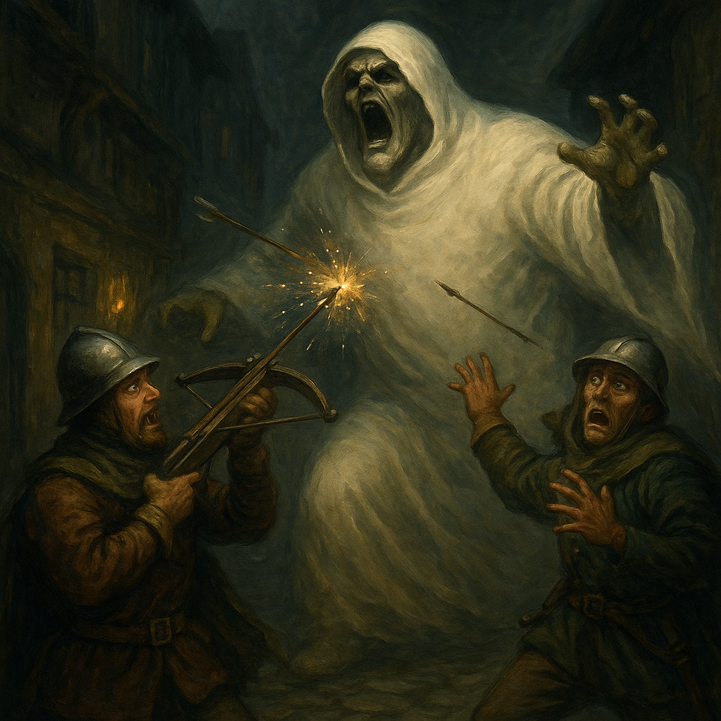 После чего призрак опустил на грешную землю перепуганного подмастерье, и неспешным шагом удалился, скрывшись за углом.