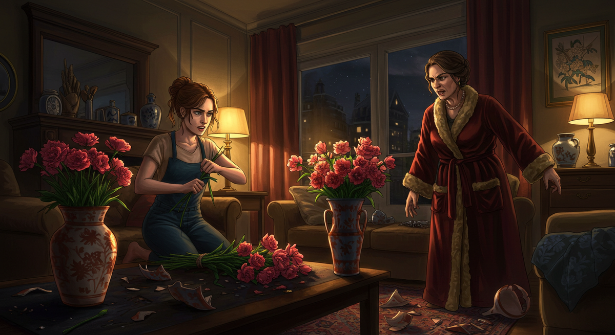 Но свекровь уже хватала следующую вазу. И следующую. Она двигалась по студии, как тайфун, сметая все на своем пути. Вода заливала пол, лепестки хрустели под ее каблуками.