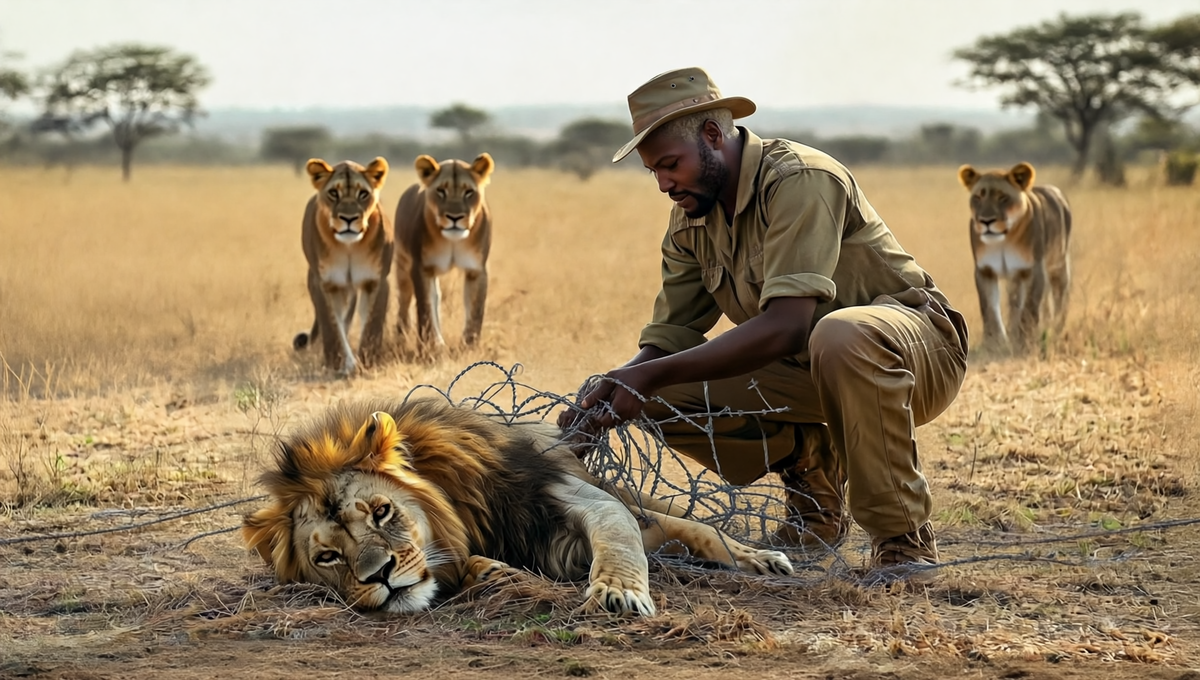 За кустами его ждал кошмар — огромный самец льва, опутанный стальной петлёй, избитый, но не сломленный. Не рычание, а глухой стон разрезал тишину саванны. Любое неверное движение — и всё кончено. Маркус снял рюкзак, достал кусачки, и шагнул туда, где обычно заканчивается человеческая смелость.