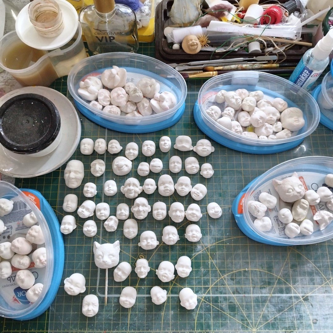 Немного закулисья. Так рождаются детки, сначала лица. Потом головы, а уж они дальше диктуют кем они будут. Еще не совсем освоилась с гипсом, но начало положено.
