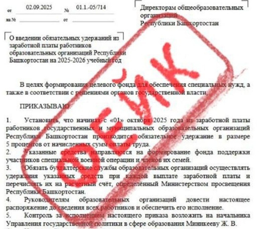 В социальных сетях и мессенджерах распространяется письмо за подписью первого заместителя министра просвещения Башкортостана Светланы Антипиной к директорам школ. В нём говорится, что с 1 октября 2025 года из зарплат сотрудников будут удерживать 5% в пользу участников специальной военной операции и их семей. В ведомстве утверждают, что это фейк. – Данное письмо не соответствует действительности, просим не поддаваться на провокации, сохранять бдительность и доверять только проверенным источникам информации, – сообщили в ведомстве. – Вся официальная информация размещается на сайте министерства просвещения РБ, а также на официальных страницах ведомства в соцсетях. Фото: Минпросвещения РБ