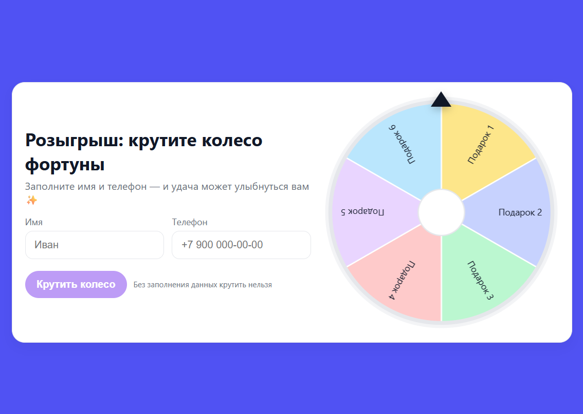 Геймификация давно стала мощным инструментом интернет-маркетинга. Людям нравится играть, пробовать удачу и получать бонусы, даже если речь идёт о небольшой скидке или промокоде. Поэтому колесо фортуны - это не просто развлечение, а эффективный способ вовлечения и сбора заявок.
