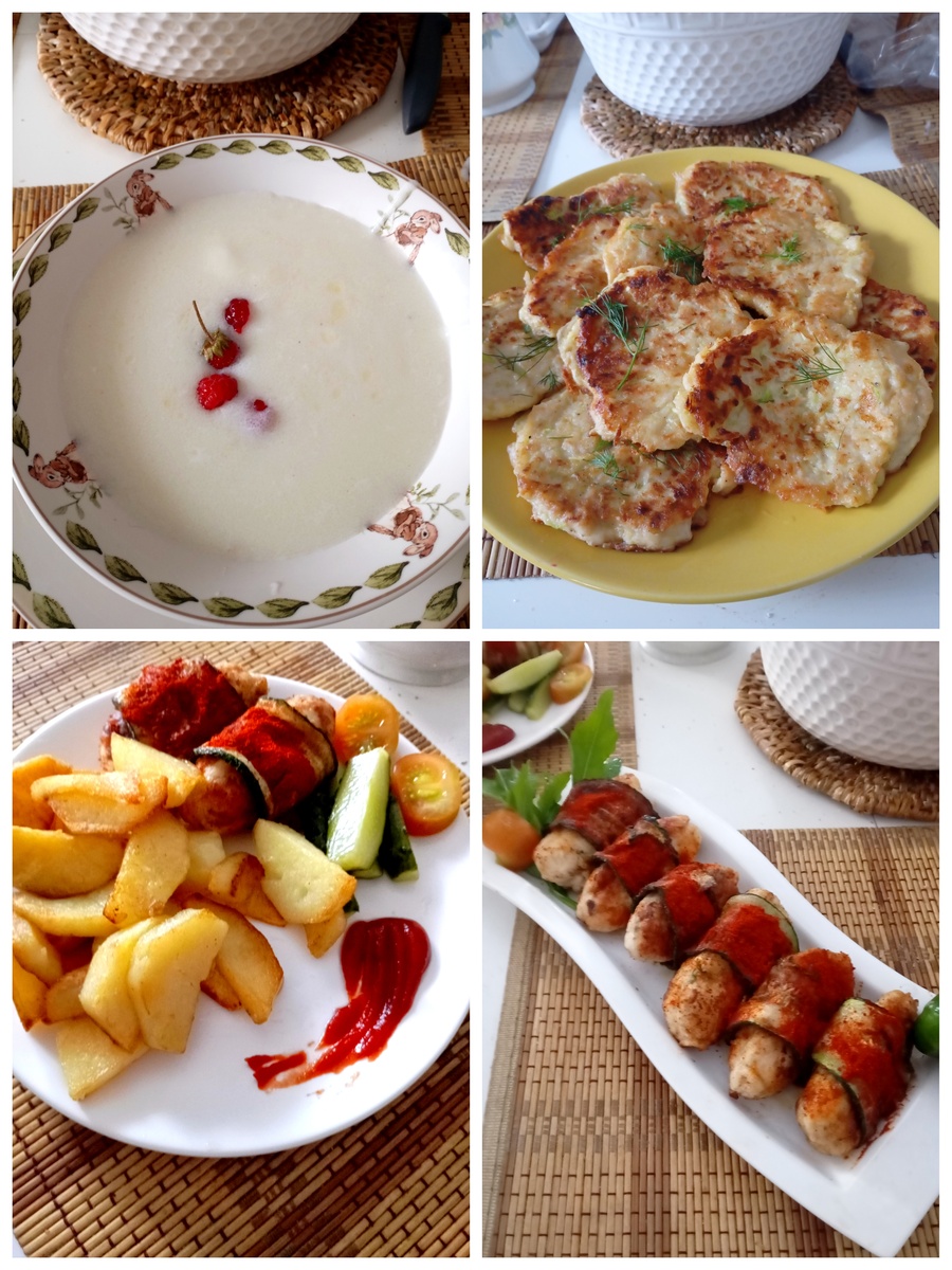 Из кабачков дыруны и котлетки с начинкой. А ещё на завтрак каша и вкусный жареный картофель.