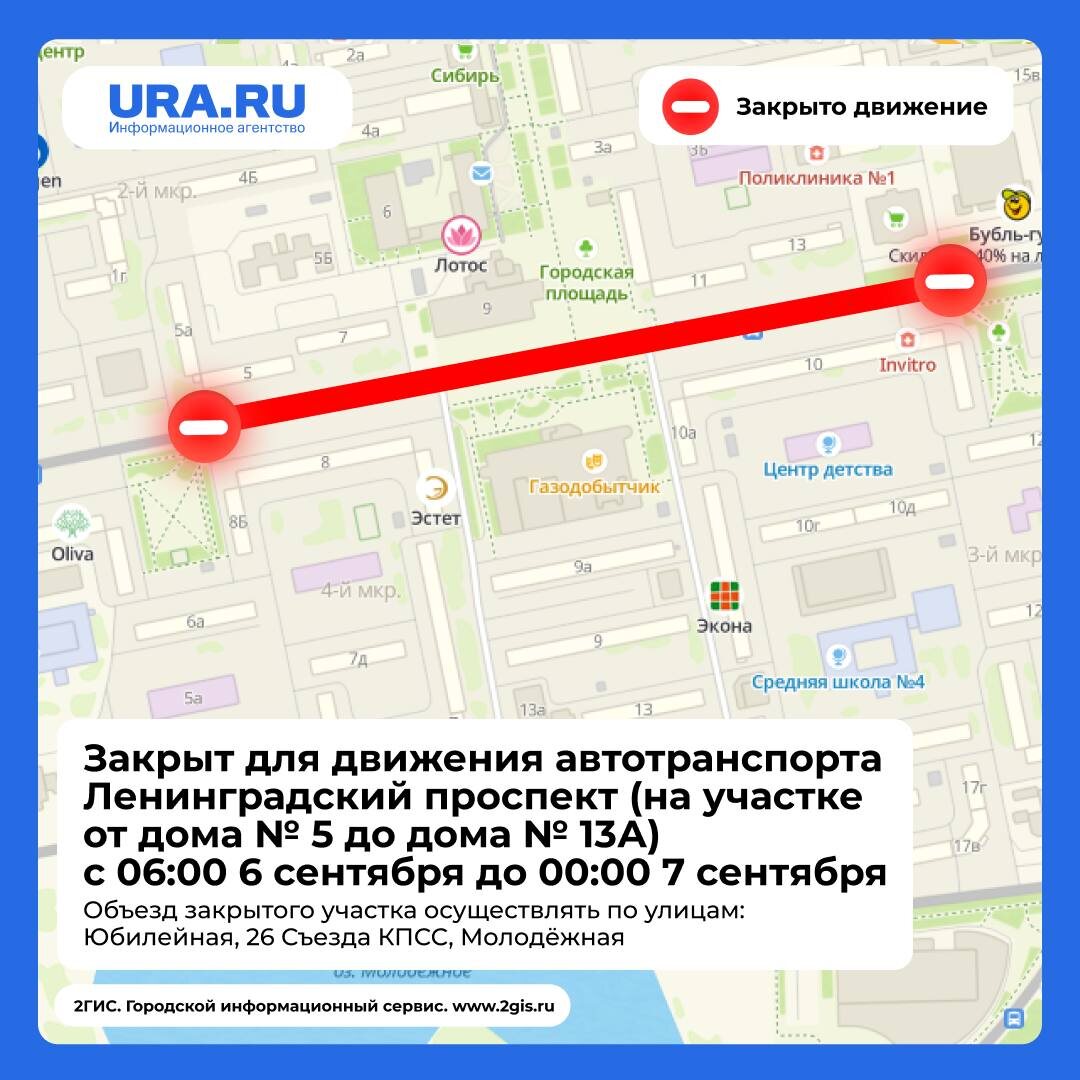 ⚡Центр Нового Уренгоя перекроют на три для В связи с празднованием юбилея Нового Уренгоя с 6 по 8 сентября будет временно ограничено движение транспорта на центральных улицах города. 🩵Ленинградский проспект (от д. №5 до д. №13А) С 6:00 6 сентября до 00:00 7 сентября. 🩵с 6:00 6 сентября до 00:00 8 сентября проезд Народов Севера 🩵проезд им. Заура Керейтова (в районе КСЦ «Газодобытчик») 🩵проезд им. майора Минеева (около ГДК «Октябрь») 🩵Объезд: по ул. Юбилейная, ул. 26 Съезда КПСС, ул. Молодежная. Также автобусы маршрутов №3, 6, 7 будут ходить по измененному маршруту. Подписаться | Прислать новость | Дать «буст»