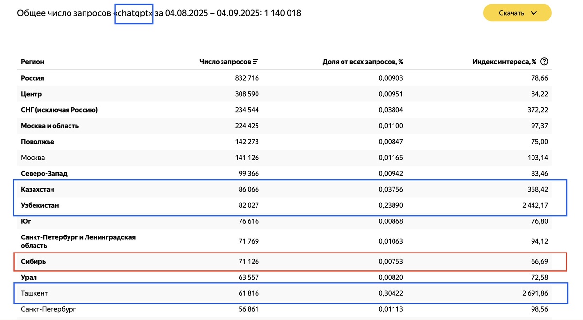 ποΈΠΠΎΠ΄ΠΊΠ°ΡΡ ΠΠ½Π΄Π΅ΠΊΡ ΠΈΠ½ΡΠ΅ΡΠ΅ΡΠ° (ΠΈΠ»ΠΈ Π°ΡΡΠΈΠ½ΠΈΡΠΈ-ΠΈΠ½Π΄Π΅ΠΊΡ) ΠΏΠΎΠΊΠ°Π·ΡΠ²Π°Π΅Ρ, Π½Π°ΡΠΊΠΎΠ»ΡΠΊΠΎ ΠΆΠΈΡΠ΅Π»ΠΈ ΠΊΠΎΠ½ΠΊΡΠ΅ΡΠ½ΠΎΠ³ΠΎ ΡΠ΅Π³ΠΈΠΎΠ½Π° ΠΈΠ½ΡΠ΅ΡΠ΅ΡΡΡΡΡΡ ΠΊΠ°ΠΊΠΎΠΉ-ΡΠΎ ΡΠ΅ΠΌΠΎΠΉ Π±ΠΎΠ»ΡΡΠ΅ ΠΈΠ»ΠΈ ΠΌΠ΅Π½ΡΡΠ΅, ΡΠ΅ΠΌ Π² ΡΡΠ΅Π΄Π½Π΅ΠΌ ΠΏΠΎ Π²ΡΠ΅ΠΉ ΡΡΡΠ°Π½Π΅ (ΠΈΠ»ΠΈ ΠΏΠΎ Π²ΡΠ΅ΠΌ ΠΏΠΎΠ»ΡΠ·ΠΎΠ²Π°ΡΠ΅Π»ΡΠΌ Π―Π½Π΄Π΅ΠΊΡΠ°). 100% β ΠΈΠ½ΡΠ΅ΡΠ΅Ρ ΠΎΠ±ΡΡΠ½ΡΠΉ, ΡΠ°ΠΊΠΎΠΉ ΠΆΠ΅, ΠΊΠ°ΠΊ Π² ΡΡΠ΅Π΄Π½Π΅ΠΌ. 150% β Π»ΡΠ΄ΠΈ Π² ΡΡΠΎΠΌ ΡΠ΅Π³ΠΈΠΎΠ½Π΅ ΠΈΡΡΡ ΠΏΠΎ ΡΠ΅ΠΌΠ΅ Π² ΠΏΠΎΠ»ΡΠΎΡΠ° ΡΠ°Π·Π° ΡΠ°ΡΠ΅, ΡΠ΅ΠΌ Π΄ΡΡΠ³ΠΈΠ΅. 50% β Π½Π°ΠΎΠ±ΠΎΡΠΎΡ, ΠΈΠ½ΡΠ΅ΡΠ΅Ρ Π·Π΄Π΅ΡΡ Π² Π΄Π²Π° ΡΠ°Π·Π° Π½ΠΈΠΆΠ΅, ΡΠ΅ΠΌ Π² ΡΡΠ΅Π΄Π½Π΅ΠΌ. ΠΡΠ±ΠΎΠΏΡΡΠ½ΠΎ Π±ΡΠ»ΠΎ ΠΏΠΎΡΠΌΠΎΡΡΠ΅ΡΡ ΠΏΠΎ Π·Π°ΠΏΡΠΎΡΡ "chatgpt". Π‘ΠΌΠΎΡΡΠΈΡΠ΅ ΠΊΠ°ΠΊΠ°Ρ ΡΡΡΠΊΠ°. Π Π ΠΎΡΡΠΈΠΈ, ΡΠ°ΠΊ ΠΊΠ°ΠΊ Π΄Π»Ρ ΠΌΠ°ΡΡΠΎΠ²ΠΎΠΉ Π°ΡΠ΄ΠΈΡΠΎΡΠΈΠΈ ΡΡΠΎ Π½Π΅Π΄ΠΎΡΡΡΠΏΠ½ΠΎ ΠΈΠ·-Π·Π° ΡΠ»ΠΎΠΆΠ½ΠΎΡΡΠΈ ΠΏΠΎΠ»ΡΠ·ΠΎΠ²Π°ΡΡΡΡ vpn, Π½Π΅ΠΉΡΠΎΡΠ΅Ρ