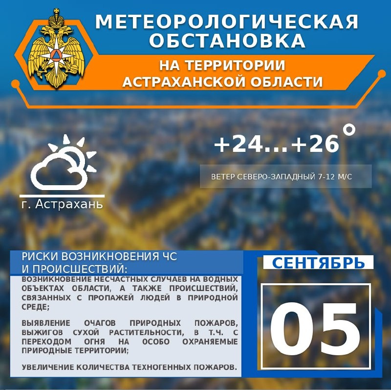 🍁Метеорологическая обстановка на 05 сентября ⛅️На территории области переменная облачность. Без существенных осадков. Ветер северо-западный 7-12 м/с.🌡 Температура воздуха +22...+27°. По г. Астрахань переменная облачность. Без существенных осадков.☁️ Ветер северо-западный 7-12 м/с.🌡 Температура воздуха +24...+26°. ✅Присоединяйся к МЧС Астрахань 👉Подписывайся на МЧС России в Telegram | MAX