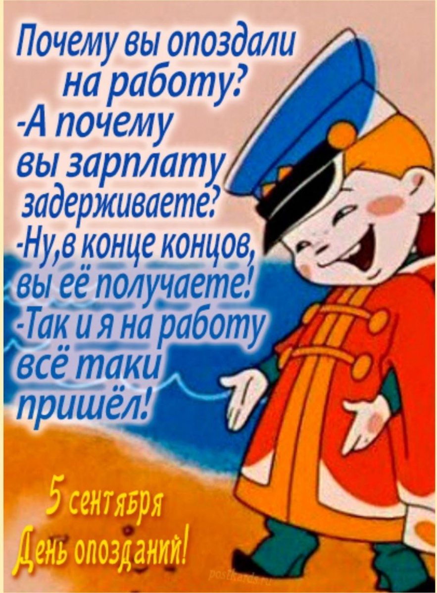 Принято считать, что День опозданий был введен в перечень национальных праздников членами Клуба прокрастинаторов США в 1956 году. Наконец у девушек, которые привыкли неторопливо собираться на свидание, нашелся вполне официальный повод для того, чтобы заставить своего кавалера ожидать. :)) Звериная сходка в африканских джунглях. Лев царственно и лениво делает замечание жирафу: – Почему опаздываем? Сказано же было, что встреча назначена на закате! Жираф с усмешкой: – Не знаю, как для вас, а для меня закат ещё не наступил. ;) Учительница отчитывает нерадивого школьника: – Ну, и почему ты снова опоздал на урок? Тот, даже ни капли не покраснев: – Ну так вы же сами вчера говорили, что учиться никогда не поздно! ;) Улитки и черепахи – крайне медлительные создания, но вы когда-нибудь слышали, чтобы хоть одна улитка или черепаха куда-то опоздала? ;) Сотрудник пишет начальнику СМС: «Прошу прощения за опоздание, но меня сегодня не будет!».
