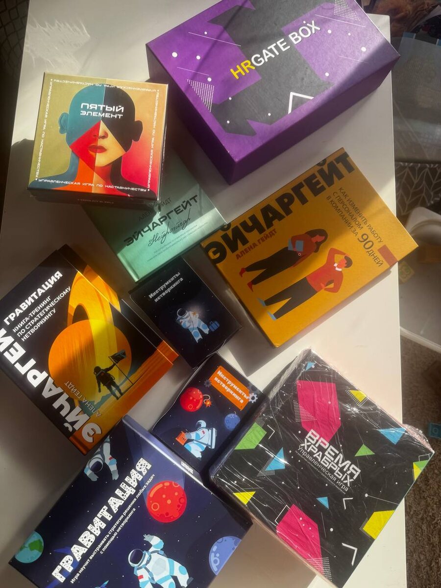 Увидела вчера пост у Павла Безручко про эмоции и мотивы писать, а у меня еще и на тг курсе по старту портфельной карьеры как раз спринт про авторов идет, и решила написать про свои мотивы и эмоции, как появлялись мои авторские продукты любимые. Для начала сфотографировала все и это вау!!!! Кстати, 2 игры - гравитация и время храбрых - это последние коробки, надо еще у издательства заказывать допечать , все разобрали. И вот. Книга «Как изменить работу с персоналом в компании за 90 дней» была написана первой, в третьем декрете моем, в 2021 году и в печать ушла накануне февраля 2022. Эмоция была основная - закрыть гештальт и уже что-то давать почитать адресатам, которые обращались за консультациями по hr процессам постоянно, а я к тому времени уже устала эти консультации давать :). Книга хит, на озоне закончилась давно, у меня какое-то количество осталось, но тоже надо дозаказать. Тираж 1000 😁😁. Дальше первая бизнес игра моя по наставничеству «Пятый элемент». Ее я делала на эмоции э