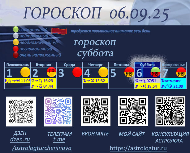 Мы находимся в коридоре затмений. Завтра Лунное затмение. Будьте внимательны ко всему происходящему в коридоре затмений. Говорят, что мы не умеем читать знаки, посылаемые нам судьбой, так вот — в этот период знаки судьбы куда более, чем читаемы. Рекомендую прочитать мои публикации: О коридоре затмений и общем влиянии затмений "Коридор затмений Затмения 2025 Что происходит в период затмений" О предстоящем лунном затмении "Лунное затмение 07.09.25 На кого окажет наибольшее влияние" Первая половина дня наполняет нас тёплой и лёгкой энергией, что особенно ценно в выходной. Мы становимся более общительными, привлекательными и открытыми для новых знакомств и приятных встреч. Возможны неожиданные приглашения на вечер, романтические свидания или выгодные предложения, связанные с личными и финансовыми возможностями. Например, можно получить приглашение на интересное мероприятие или встретить человека, который откроет новые перспективы. С 18:00 и до позднего вечера возможны неожиданные перемены