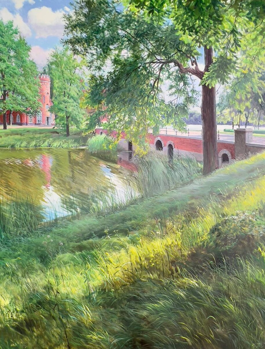 Екатерининский парк. Птичный домик. 90х70 холст/масло 2025 ••• «Екатерининский парк. Птичный домик» продолжает развивать общий подход в серии. Известная постройка, являющаяся частью царскосельского Адмиралтейства, вновь глубоко утоплена в природную стихию. На переднем плане подробно написан берег пруда, заросший луговыми травами. В этой картине ярко ощущается движение ветра, об этом говорят и рябь на воде, и колышущиеся ветки, и растрепанные травинки, подсвеченные солнечными бликами. ••• Стать обладателем своего личного петербургского парка можно в галерее YOLKA art до 10 сентября. ••• Москва. Ходынский бульвар 20а, с 11:00 до 21:00 ежедневно. Выставка бесплатная, работы продаются. Вся контактная информация на сайте YOLKA.art