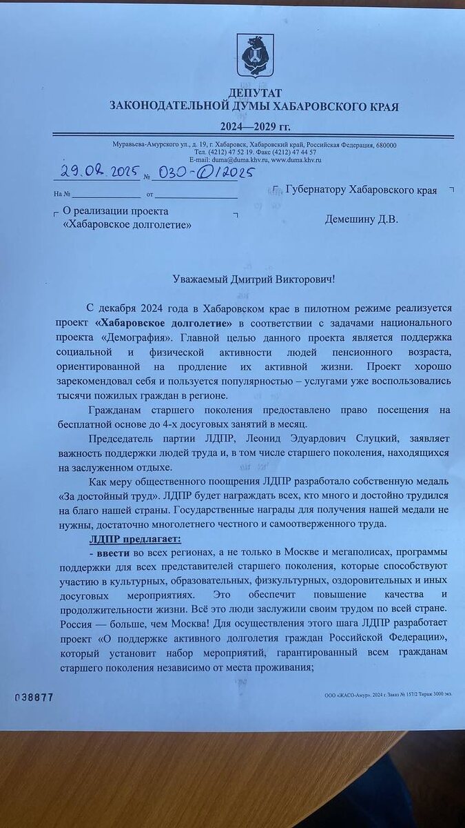 ЛДПР предлагает расширить «Хабаровское долголетие» Руководитель фракции ЛДПР в Законодательной Думе Хабаровского края Сергей Зюбр обратился к Губернатору Дмитрию Дамешену с предложением расширить проект «Хабаровское долголетие», который сегодня реализуется в пилотном режиме. 📌 Сейчас пожилые жители края могут бесплатно посещать до 4-х занятий в месяц — спортивных, культурных, образовательных и оздоровительных. ЛДПР предлагает увеличить эту норму минимум до 8 занятий и распространить проект на все муниципалитеты региона. «Люди труда заслужили не только пенсию, но и возможность активного участия в жизни общества» , — отметил Сергей Зюбр. Также партия настаивает на: ✔️сохранении льгот для северян и ветеранов труда; ✔️повышении пенсий до 2 МРОТ; ✔️снижении пенсионного возраста; ✔️учреждении Дня ветерана труда.