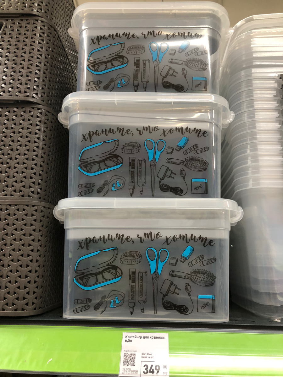 В продаже появились новые контейнеры для хранения. Они прозрачные с декором. Крышка на защелках, имеется ручка для переноски. Объем 6,5 литров. В составе полипропилен. Производитель Россия. Цена 349 рублей.