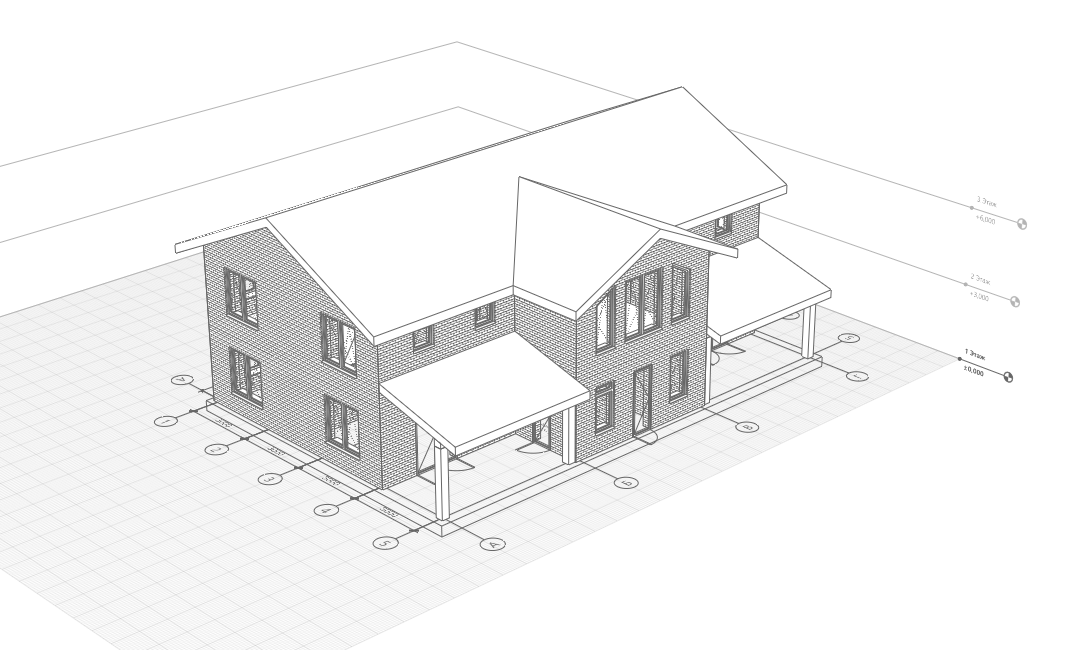 2 - на плане 2-го этажа видны односкатные крыши веранд - это хорошо. Края этих крыш выровняйте вдоль осей А и Г. Сейчас на фото края крыш вдоль осей А и Г скошены: