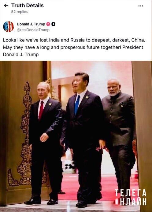 Отрицание, торг, принятие? Президент Трамп опубликовал в своей соцсети фото с саммита ШОС с «прощальной» подписью: Похоже, мы потеряли Индию и Россию в пользу Китая, самого темного и бездонного. Пусть их ждет долгое и процветающее будущее вместе! Заметили, кстати, что в последнее время фоточек президента России в соцсетях «агента» Дональда едва ли больше, чем его самого. К чему бы это? 🚲 Подпишись на Телега Online