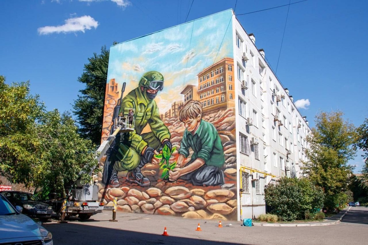 В Оренбурге на фасаде дома по ул. Туркестанской, 37 появилось граффити «Корни будущего» от Андрея Корниенко.