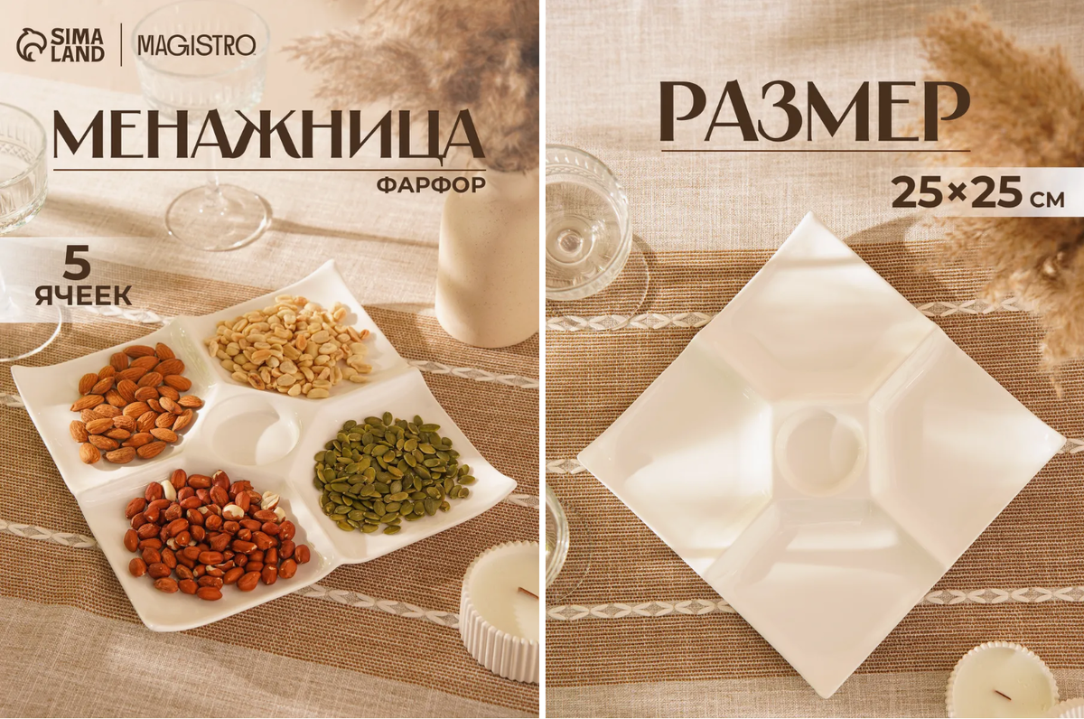 Всегда хотелось, чтобы подача даже простых закусок выглядела как в крутом ресторане. И вот она, палочка-выручалочка! Это изящная фарфоровая менажница, разделённая на пять отсеков. Она мгновенно упорядочивает стол, превращая хаос из множества мисочек в единую, гармоничную композицию. Идеально для оливок, орехов, разных соусов или даже для набора закусок.