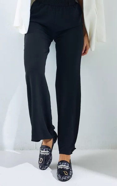 Свободный крой палаццо с высокой посадкой визуально удлиняет ноги и создаёт женственный силуэт. Брюки представлены в классическом чёрном цвете, что делает их универсальными для различных образов – от повседневных до более торжественных. Дизайн дополнен резинкой на поясе для максимального комфорта.